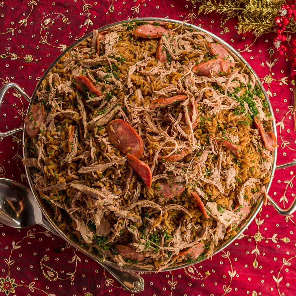 preparado com um pato inteiro, lentamente assado e temperado, resultando em um arroz solto e repleto de sabores intensos.