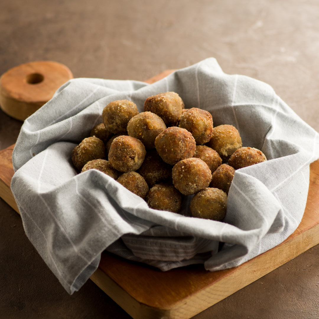 Diretamente do coquetel dos nossos eventos, o aperitivo que transforma qualquer reunião em uma festa! Bolinho com uma saborosa e marcante massa de carne de cordeiro e no centro recheio de queijo de cabra