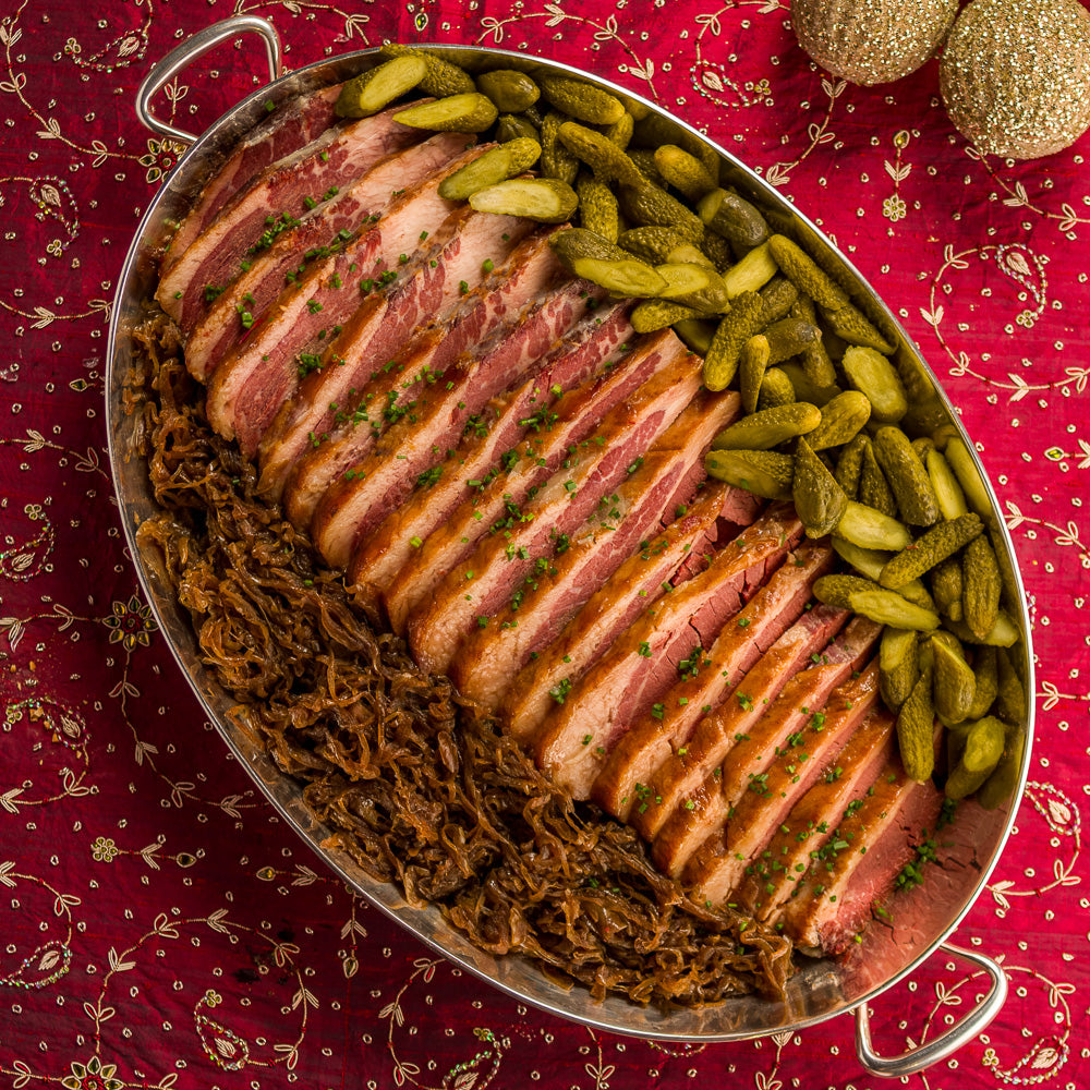 Brisket Defumado à Moda Charlô com Cebola Caramelizada- Picles de Pepino eDip de Mostarda