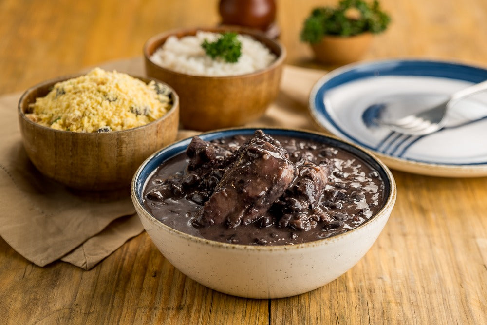 Nossa feijoada caseira, cozinhada por horas com costelinha, carne seca, linguiça, lombo, bacon, paio e folhas de louro que harmonizam perfeitamente com as carnes. Ideal para um momento especial em família!