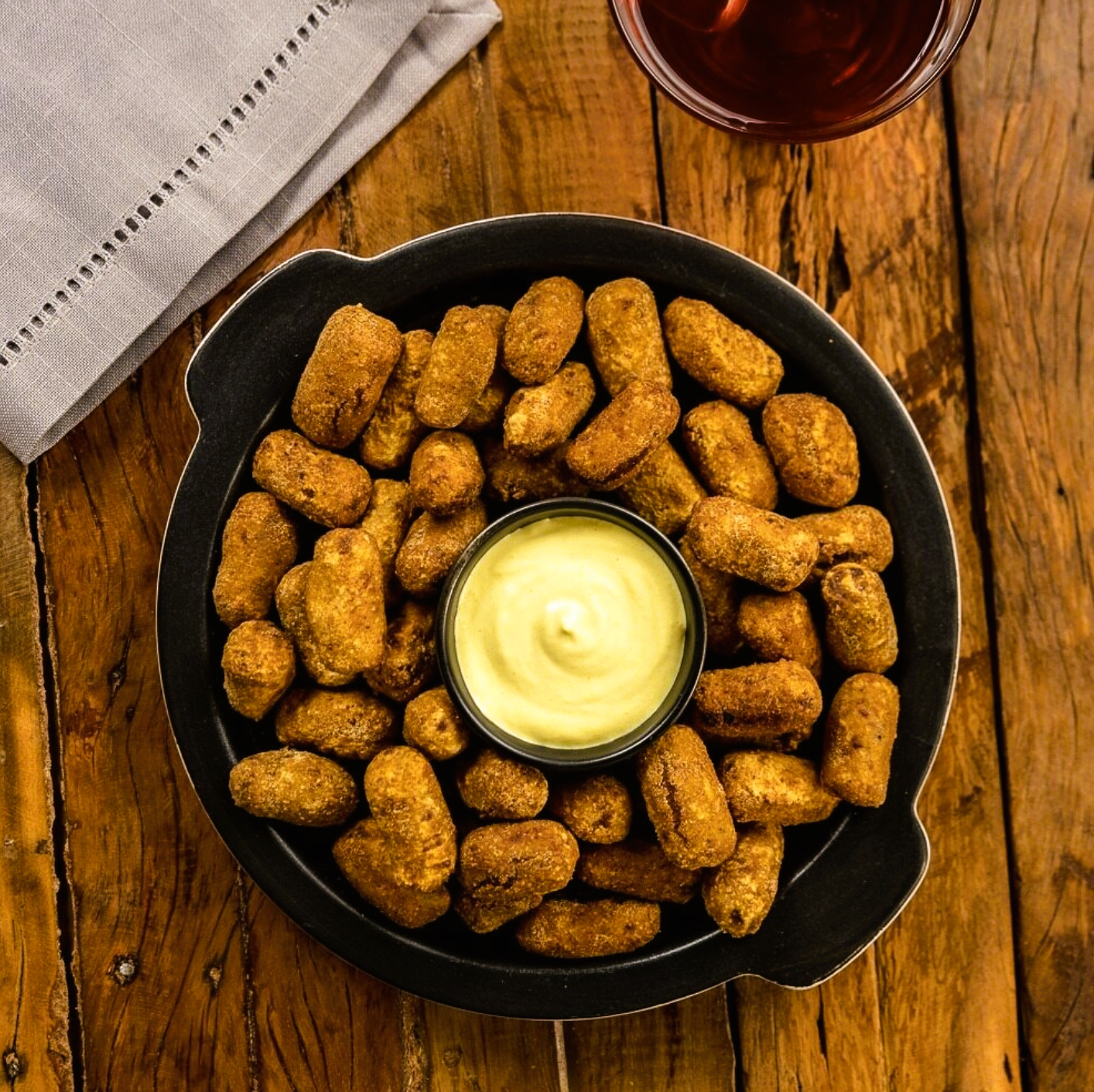Croquetinhos recheados com uma massa saborosa de carne bovina, alho poró, cebola, cenoura e salsão. O único problema de pedir esse aperitivo é esquecer que o prato principal ainda não chegou. Aconselhamos pedir com o Dip de Mostarda Dijon